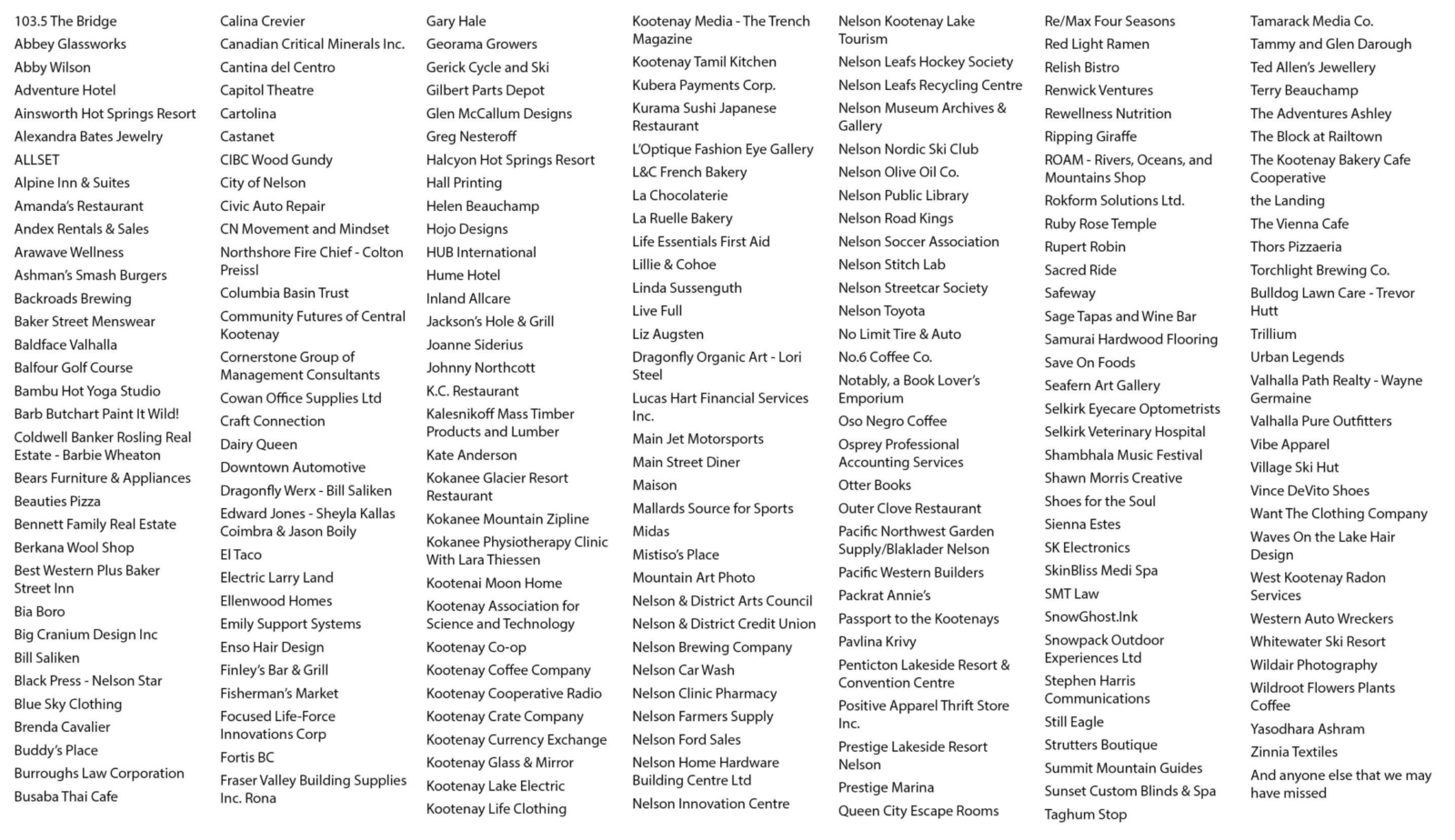 Special thanks to the entire business community of Nelson for their generous donations and for being in business and showing perseverance and commitment to do what it takes to succeed – hiring staff, making payroll, paying the bills, and keeping the doors open day in and day out, year after year – while being so generous to so many fund-raising efforts. Businesses like yours are what make Nelson so special and unique. Think of these businesses and thank them next time you stop in.